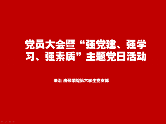 2022年4月24日下午四时,中共一本道 、法律硕士教育一本道 第六学生党支部召开党员大会暨“强党建、强学习、强素质”主题党日活动。支部书记王斌通领学,支部副书记杨宇航主持,党支部全体正式党员、预备党员、发展对象、积极分子参加并讨论。