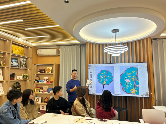 西安艺舍美学馆晓明老师讲述了中国历代扇子的演变历史,简要介绍了团扇与折扇的区别,针对绘画材料的选用、作画的步骤进行了详细解读,指导同学们在扇面上进行艺术创作。