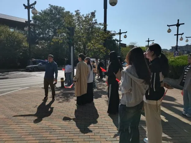 经过长时间徒步,师生们抵达了曲江池遗址公园。这里绿树成荫,池水清澈,呈现出一幅生态和谐、景致宜人的自然画卷。在公园的步行道上,大家纷纷就各自的环保实践经历以及参与此次活动的深刻感受进行了交流,整个徒步过程欢声笑语不断,氛围融洽而热烈。