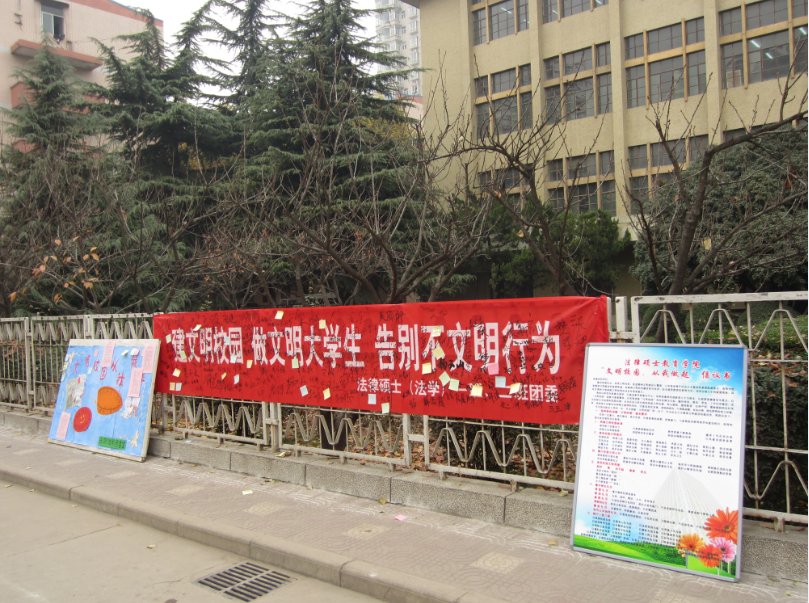 活动中,各班级积极组织,认真筹划,结合大学生校园生活实际,策划了形式丰富的主题活动。2012级法律硕士(法学)一、二班团支部召开主题班会,首先在班级内部积极宣传“文明校园,从我做起”活动相关内容及意义,并组织全体同学观看相关视频,以此提高同学们的建设文明校园,做文明青年的意识;2012级法律硕士(非法学)二班团支部积极开展“文明课堂”、“文明就餐”、“文明上网”、“共铸诚信、从我做起”等一系列活动,结合校园实际,呼吁全校师生踊跃参与到活动中来,用自己的行动为文明校园的创建贡献力量。活动进行得如火如荼,同学们参与的热情也空前高涨。在印有“建文明校园,做文明青年,告别不文明行为”的横幅前,同学们纷纷驻足,写下自己的祝福和姓名;在主题班会中,同学们踊跃发言,积极阐述自己对创建文明校园的建议,并认真聆听和学习了《创建文明校园倡议书》。
