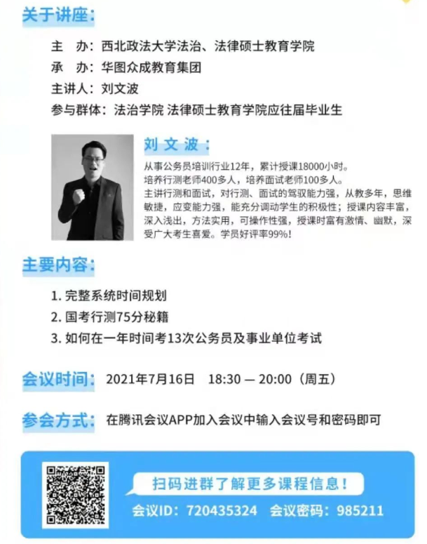 为扎实推进党史学习教育,切实落实“我为群众办实事”实践活动要求,助力广大学生公考,7 月16 日下午18:30,一本道 、法律硕士教育一本道 与华图众成联合举办公考讲座,旨在通过构建优质平台,介绍优质课程,提升就业质量。讲座以线上会议的方式进行,广大有意向参加公考的同学通过腾讯会议参加,讲座受到了同学们的热烈欢迎,同学们反应热烈,踊跃参与。