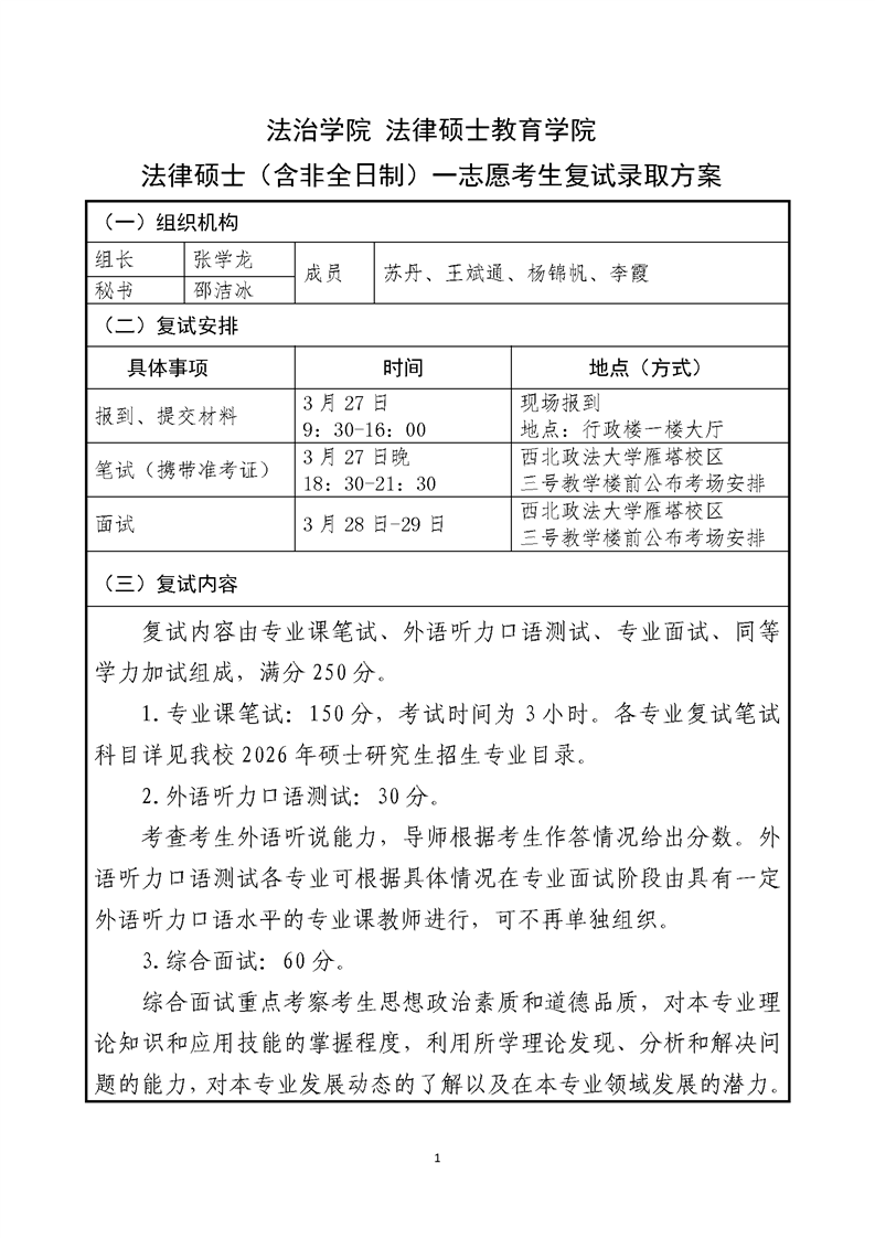 一本道 法律硕士教育学院 法律硕士(含非全日制)一志愿考生复试录取方案