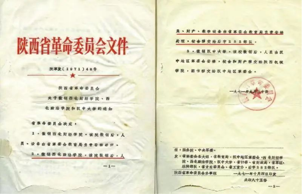 1971年9月30日,陕西省革命委员会以“陕革发[1971]48号《陕西省革命委员会关于撤销西北财经一本道 、西北政法一本道 和汉中大学的通知》,决定撤销西北政法一本道 。通知明确规定,学校撤销后,人员、财产、教学、设备由陕西省革委会教育局负责安排处理,校舍全部移交给总后232部队。1971年8月、9月间,全校教职工和家属已全部从白水县返回西安。全体教职员工266人于1972年上半年分配到其他高等院校、省属企业和外省区。据统计,分配至陕西师范大学、西安交通大学、西安外国语一本道 、西安冶金建筑一本道 、陕西中医一本道 、西北大学、西安医一本道 、西北工业大学等共168人,省内企事业单位陕西重型机械厂、红旗手表厂、关山机械厂等共27人,外省区53人,另有18人在学校留守处工作,处理停办期间学校相关事宜。1974年,陕西省革委会教育局指示,将学校积累了几十年的二十多万册图书、设备悉数调送给今天的延安大学。其实,1970年冬天,恢复创办于1958年的延安大学差点也被撤销,后来在周恩来总理的亲自关怀下得以保留,周总理亲自批示延安大学不仅要办,而且还要办大办好。西北政法一本道 的文献设备被调配给了延安大学,让根脉相连的两所学校情缘更深。