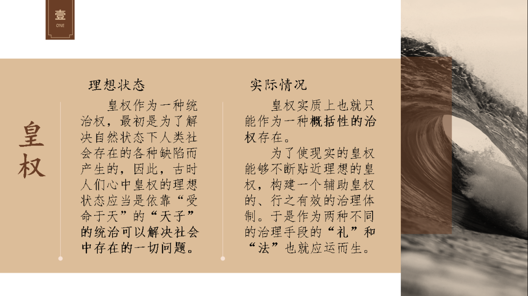关于皇权。中国很早就产生了皇权的概念,类比洛克《政府论》中对于政治社会起源的阐述,皇权作为一种统治权,最初是为了解决自然状态下人类社会存在的各种缺陷而产生的,因此,古时人们心中皇权的理想状态应当是依靠“受命于天”的“天子”的统治可以解决社会中存在的一切问题。然而,由于“天子”本人仍然是人,无法实然上达到“溥天之下,莫非王土;率土之滨,莫非王臣”这样事无巨细、近乎于神的绝对控制,皇权实质上也就只能作为一种概括性的治权存在。那么,为了使现实的皇权能够不断贴近理想的皇权,构建一个辅助皇权的、行之有效的治理体制迫在眉睫,“礼”和“法”也就应运而生,《新唐书·刑法志》开篇提出“导之以德,齐之以礼”和“作刑书”两种不同的治理手段,正说明了“礼”、“法”之于皇权的工具性。