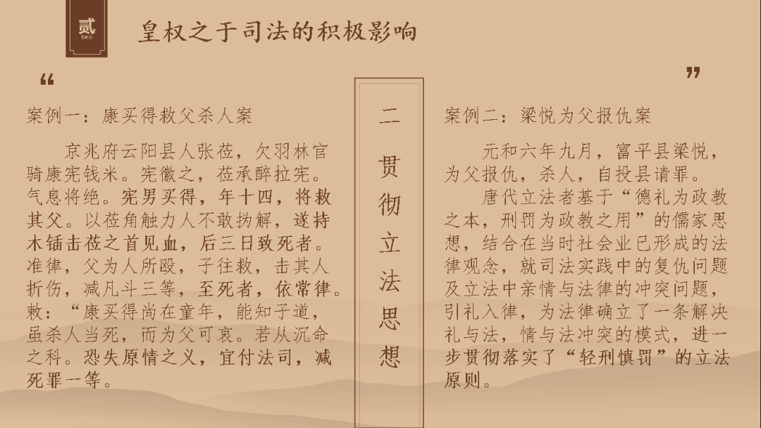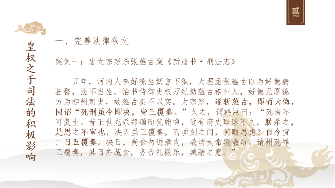 唐代司法制度虽不如当代那么科学完善,但已然形成了一个比较完整有效的逻辑机制和运行体系,能够一定程度上处理和解决社会上存在的问题和纠纷。当皇权凭借其至高无上的地位介入司法时,究竟会对司法产生怎样的影响和改变?我们将在第二部分“影响状况分析”中结合案例作进一步探究。