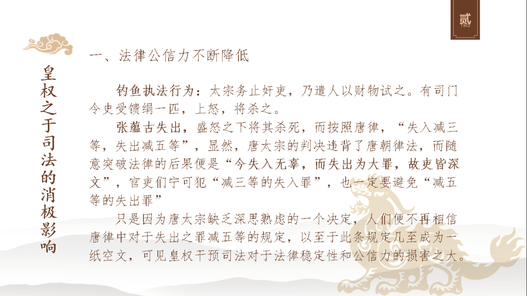 其一,皇权干涉司法会导致法律的公信力不断降低。“慎乃出令,令出惟行,弗为反”,司法秩序需要严格遵守、反复践行才能树立起在民众心中的权威和信仰。皇权却常常以极为强势的态度干扰司法,贞观初年甚至出现了“太宗务止奸吏,乃遣人以财物试之。有司门令史受馈绢一匹,上怒,将杀之”的钓鱼执法行为。正是皇权能够如此肆无忌惮地影响司法,才导致皇权在改变司法审判结果的同时,不可避免地带来了法律的混乱失序和人民之于法律信任感的降低。