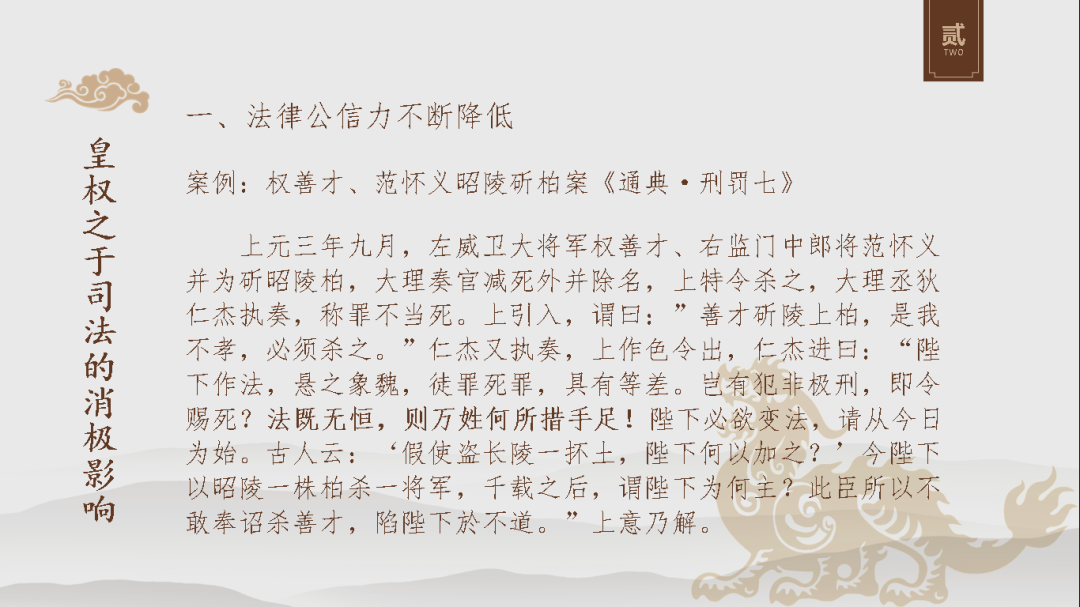 唐代杜佑所撰写的《通典·刑罚七》中记载的权善才、范怀义昭陵斫柏案亦体现了皇权对司法公信力破坏将造成严重的后果:
