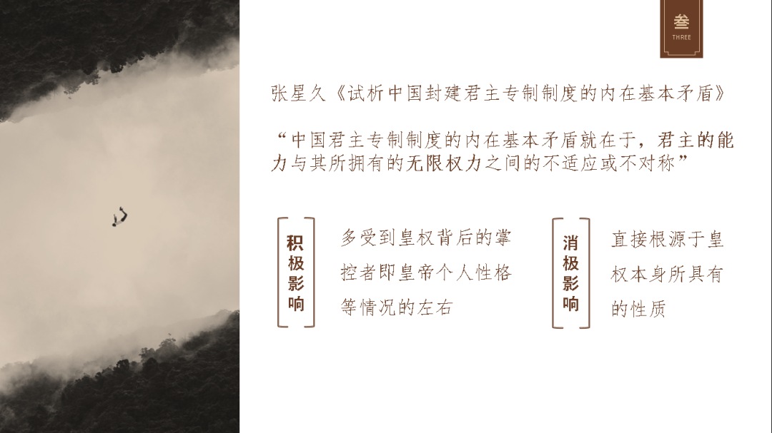 张星久在《试析中国封建君主专制制度的内在基本矛盾》一文中指出,“中国君主专制制度的内在基本矛盾就在于,君主的能力与其所拥有的无限权力之间的不适应或不对称”,也就是说,皇权本身就存在皇帝个人能力与皇权权力性质不对称的矛盾,结合我们对于皇权影响司法状况的研究,我们认为:皇权对于司法的影响是双向的,既有积极促进的一面,也有消极破坏的一面,但整体来看,积极影响更多受到皇权背后的掌控者即皇帝个人性格等情况的左右;消极影响则更多直接根源于皇权本身所具有的性质。