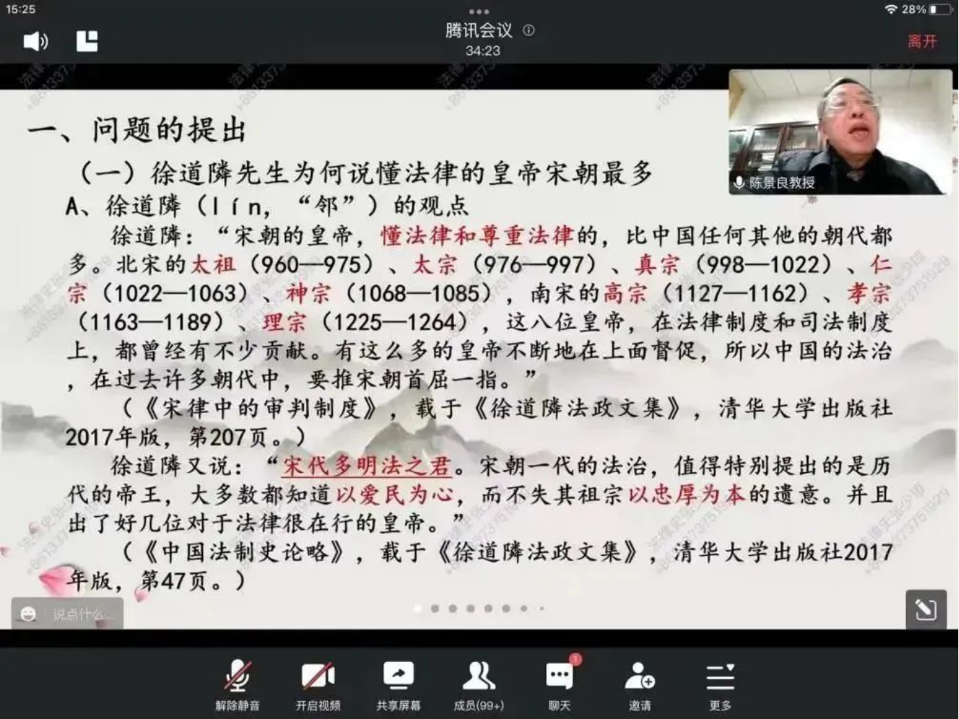 2022年11月24日15:00,由一本道 、法律硕士教育一本道 主办的一本道 建校85周年校庆研究生新生入学教育讲座在线上举行。中南财经政法大学法一本道 教授、博士生导师陈景良开展了主题为“宋理宗真的是一个懂法律的皇帝吗?”学术讲座。讲座由一本道 院长陈玺教授主持,许昌一本道 副教授王忠灿老师与湖南理工一本道 讲师、华东政法大学博士后喻平老师与谈评议,闫晓君教授及众多法律史的专家学者参与了讲座,校内外150余人参加讲座。
