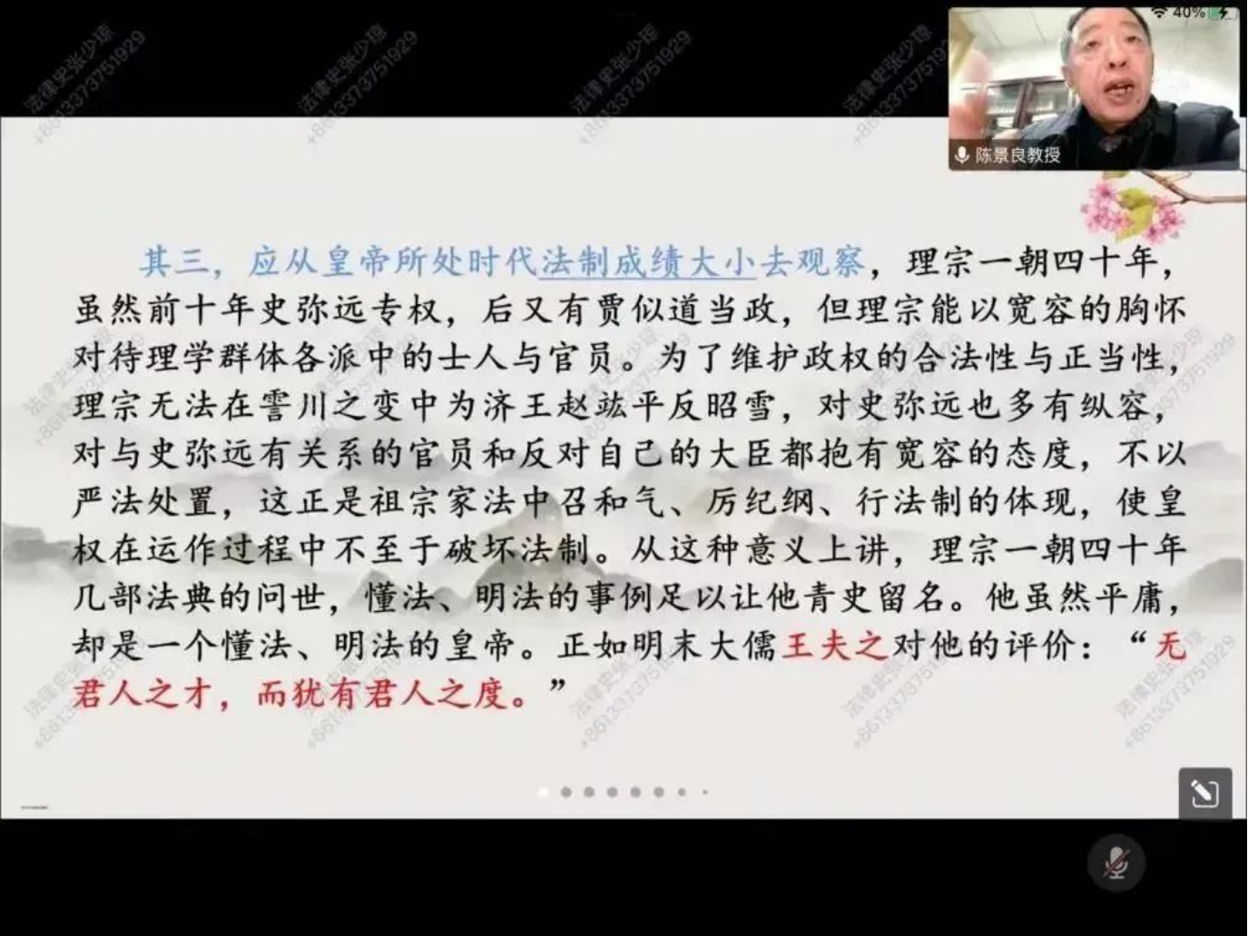 其次,在接下来的讲述中老师通过比较法律的古今异同,探讨宋代的法制与司法运作的文化原理,提出像宋代的“道理最大“的民本思想亦可与现代的理念相接榫的观点。并通过刘子健先生的著作《中国转向内在》中“皇权并不必然意味着专制”的观点从而引出在对宋理宗是否懂法这个问题讨论的同时,讨论皇权与法制的关系。在讲述的过程中,陈教授列举众多史料详细的阐述了宋理宗的生平以及相关的主要人物,例如赵竑、史弥远。