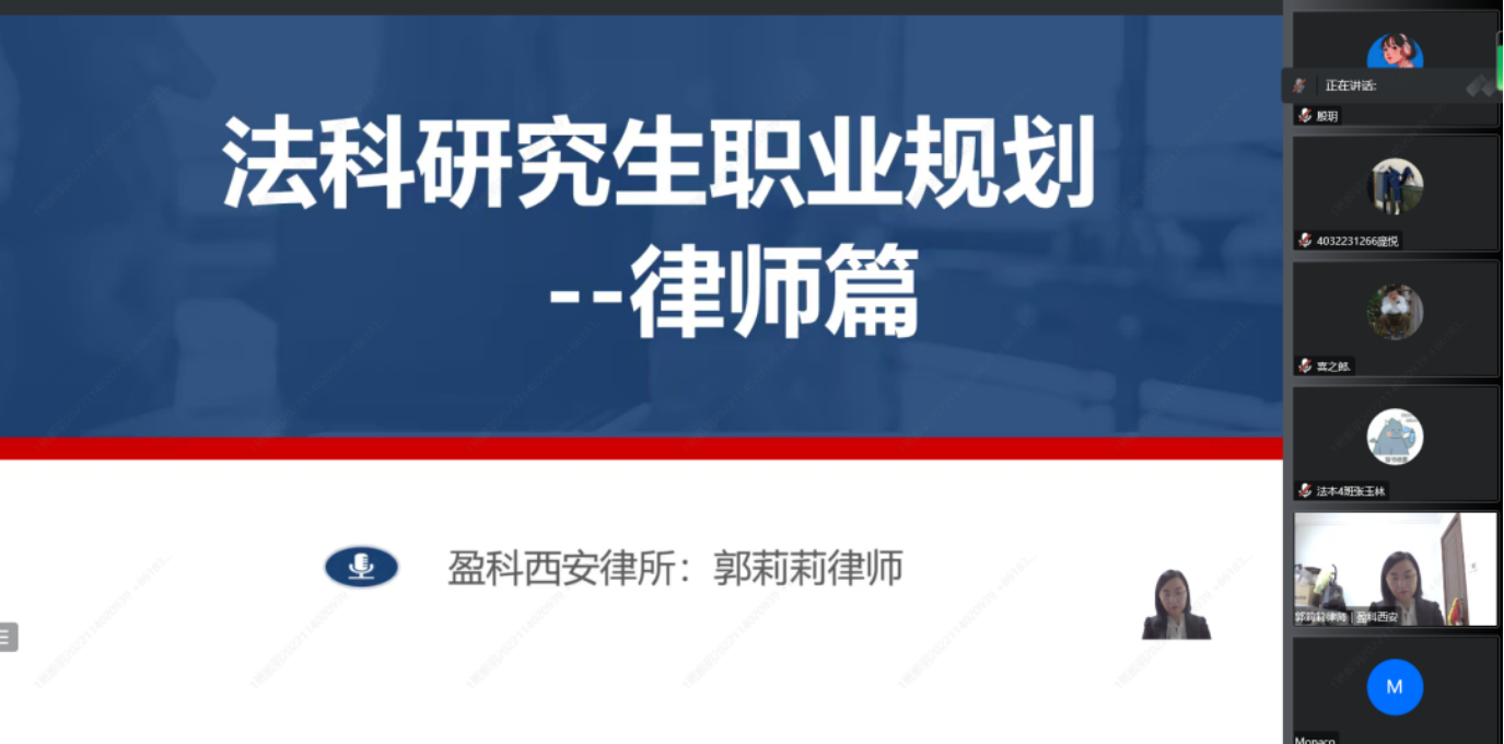 2022年11月30日下午,由一本道 、法律硕士教育一本道 主办的一本道 建校85周年系列学术讲座暨一本道 研究生新生入学教育讲座在线上举行。北京市盈科(西安)律师事务所高级合伙人郭莉莉律师以《法科研究生职业规划——律师篇》为题开展学术讲座。本次讲座由一本道 院长、教授陈玺主持,北京市盈科(西安)律师事务所业指委主任沈磊律师担任点评人。线上共百余人参与讲座。