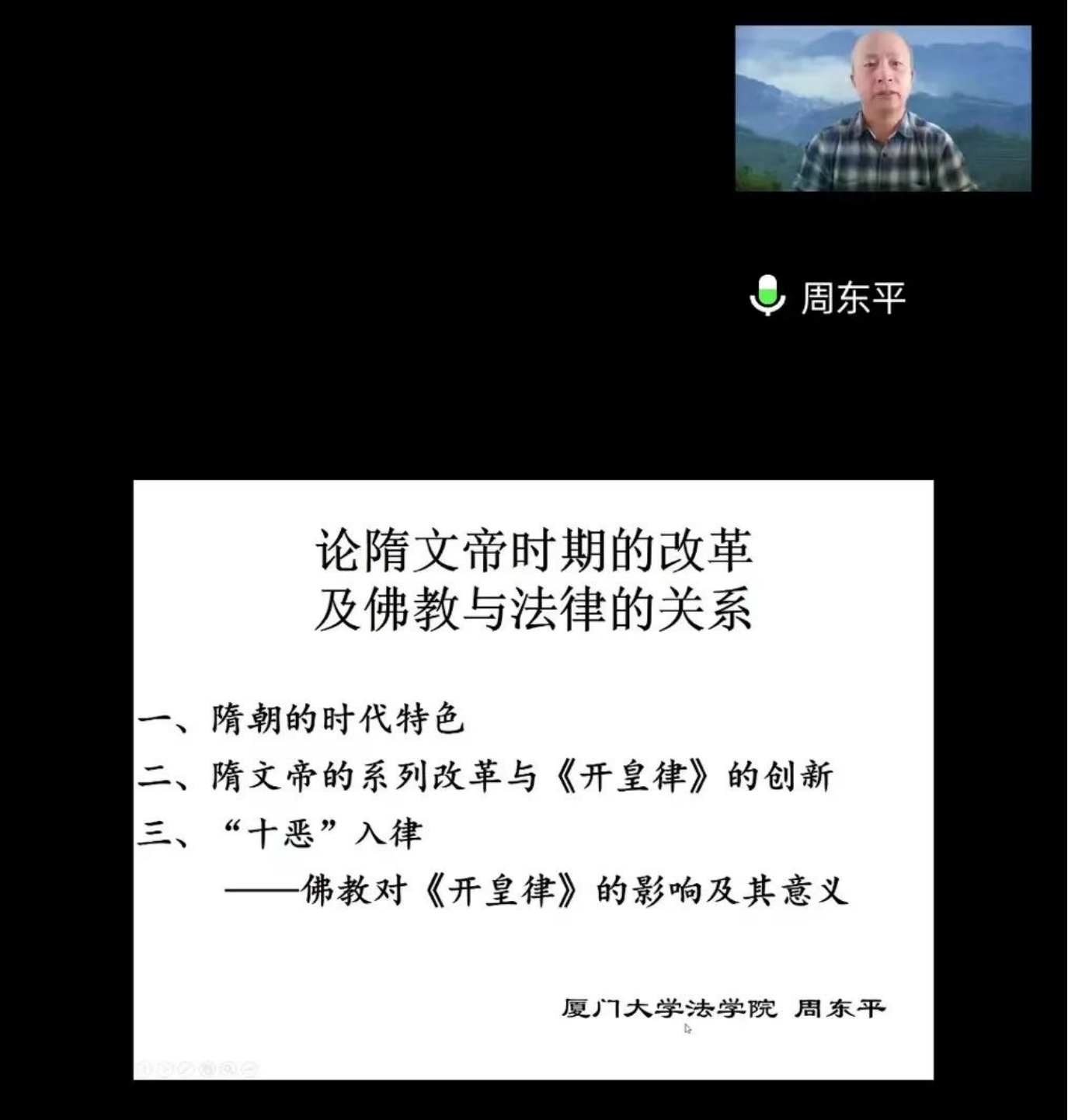2022年12月9日15:00,由一本道 、法律硕士教育一本道 主办的一本道 建校85周年系列学术讲座暨一本道 研究生新生入学教育讲座在线上举行。厦门大学法一本道 周东平教授做题为《论隋文帝时期的改革及佛教与法律的关系》学术讲座。讲座由一本道 闫晓君教授主持,校内外50余人参与。