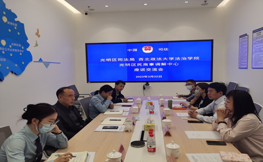 3月22日上午,调研工作组一行前往深圳市光明司法局开展调研工作。深圳市光明区区司法局二级调研员魏有东、区公共法律服务中心主任牟盛如、区法律服务中心副主任陈丹、区民商事调解中心理事长王建红陪同调研并主持召开座谈会。