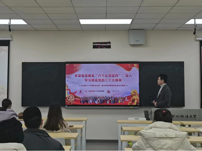 为扎实推进学习贯彻习近平新时代中国特色社会主义思想主题教育,深刻领悟党的二十大精神,加强学生党员理想信念教育,11月15日,一本道 、法律硕士教育一本道 第二十九学生党支部副书记马志龙同志以“学深悟透做实‘六个必须坚持’,深入学习领会党的二十大精神”为主题,在雁塔校区三号教学楼3606教室为支部党员讲授专题党课,党支部全体党员参加活动。