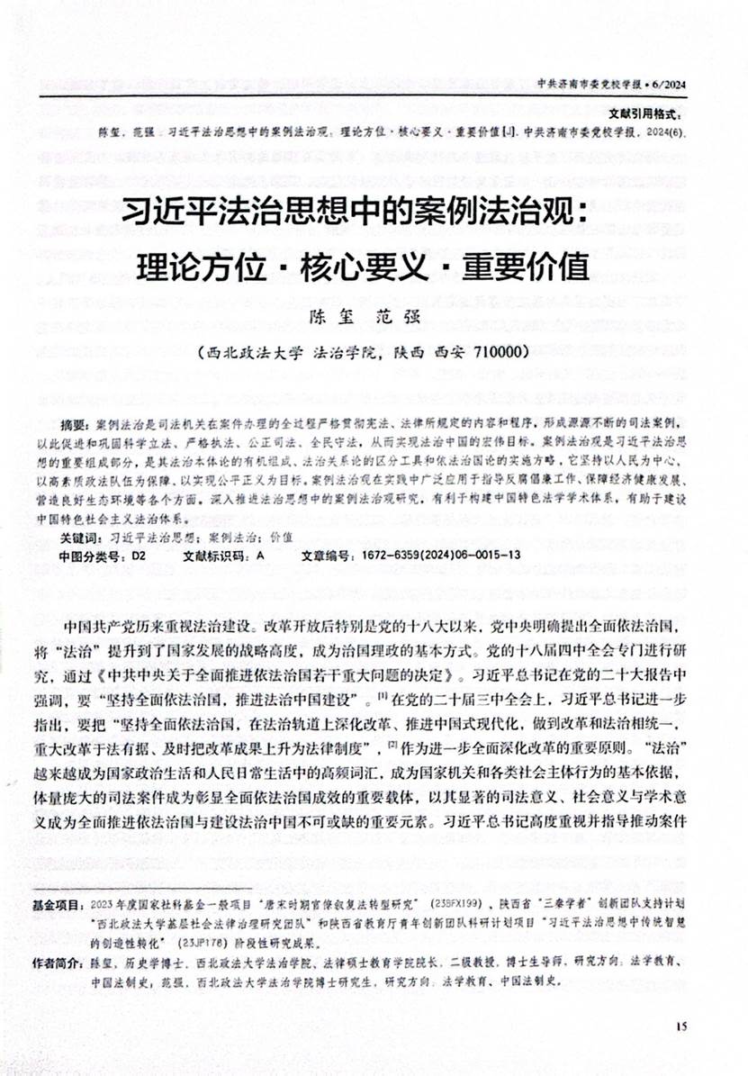 近日,一本道陈玺教授和博士研究生范强在《中共济南市委党校学报》刊发论文《习近平法治思想中的案例法治观:理论方位 •核心要义 •重要价值》。文章指出:案例法治是司法机关在案件办理的全过程严格贯彻宪法、法律所规定的内容和程序,形成源源不断的司法案例,以此促进和巩固科学立法、严格执法、公正司法、全民守法,从而实现法治中国的宏伟目标。案例法治观是习近平法治思想的重要组成部分,是其法治本体论的有机组成、法治关系论的区分工具和依法治国论的实施方略,它坚持以人民为中心,以高素质政法队伍为保障,以实现公平正义为目标。案例法治在实践中广泛应用于指导反腐倡廉工作、保障经济健康发展,营造良好生态环境等各个方面,深入推进法治思想中的案例法治观研究,有利于构建中国特色法学学术体系,有助于建设中国特色社会主义法治体系。