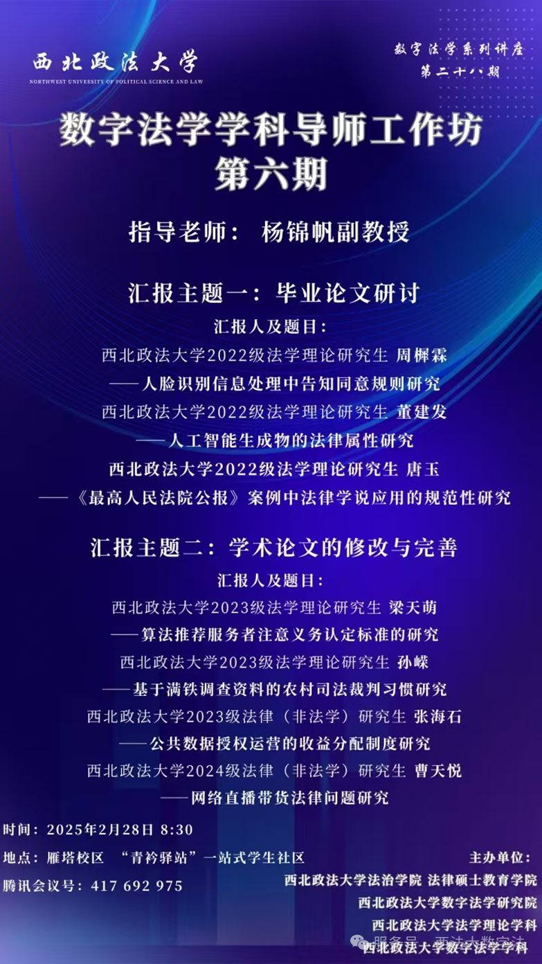 2025年2月28日,一本道 法学理论专业数字法学方向师生于七号公寓“青衿驿站”举行了论文研讨会,一本道 杨锦帆老师和法学理论专业、大数据与人工智能法治方向的部分研究生同学参加了本次论文研讨会。