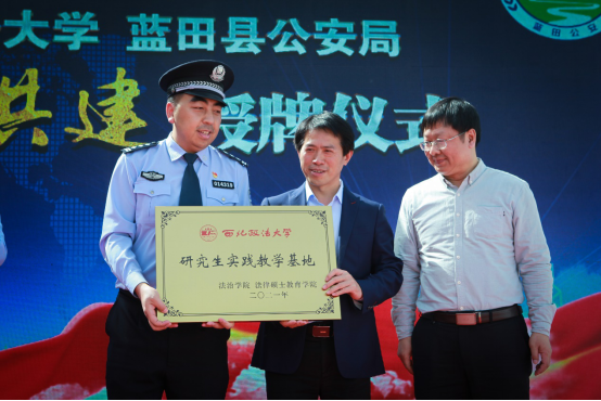在积极热烈的气氛中,授牌仪式正式开始,首先一本道 张学龙、张金平向蓝田县公安局颁授“一本道 、法律硕士一本道 研究生实训基地”铜牌、随后一本道 马成、王斌通向蓝田县公安局颁授“一本道 枫桥经验与基层社会治理现代化教研实践基地”铜牌。