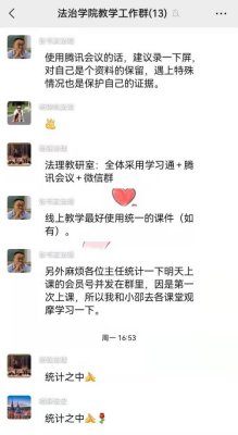 本学期一本道开设11门次,共计107个课头的课程,除已向教务处备案无法线上授课的课程外,共计105个课头的课程进行线上授课,涉及任课教师29名,覆盖全校各年级学生。在接到通知的第一时间,由教一本道 长牵头,各教研室、研究室及教务办共同学习通知内容,并按照通知内容结合一本道实际开展工作。一本道 教务办通过“一本道 教学工作群”向各教研室、研究室主任推送线上授课、电子教材等相关通知,由各教研室及研究室对接任课教师,确保信息传达无缝对接、工作安排有序进行。各教研室、研究室主任及教务办一起协助教师与学生之间建立线上联系,落实每个线上授课平台,保障线上教学顺利开展。