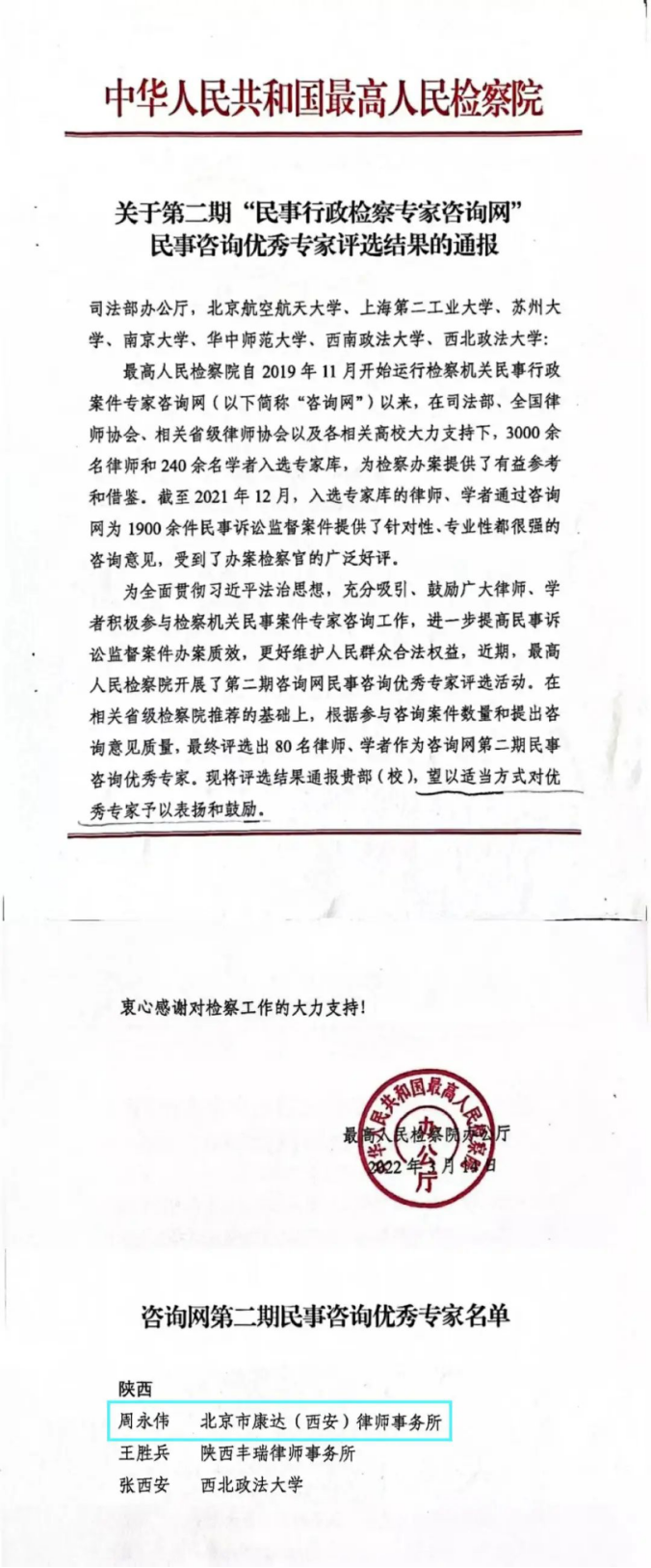 一本道实务导师周永伟被评为最高人民检察院第二期“民事行政检察专家咨询网”民事咨询优秀专家