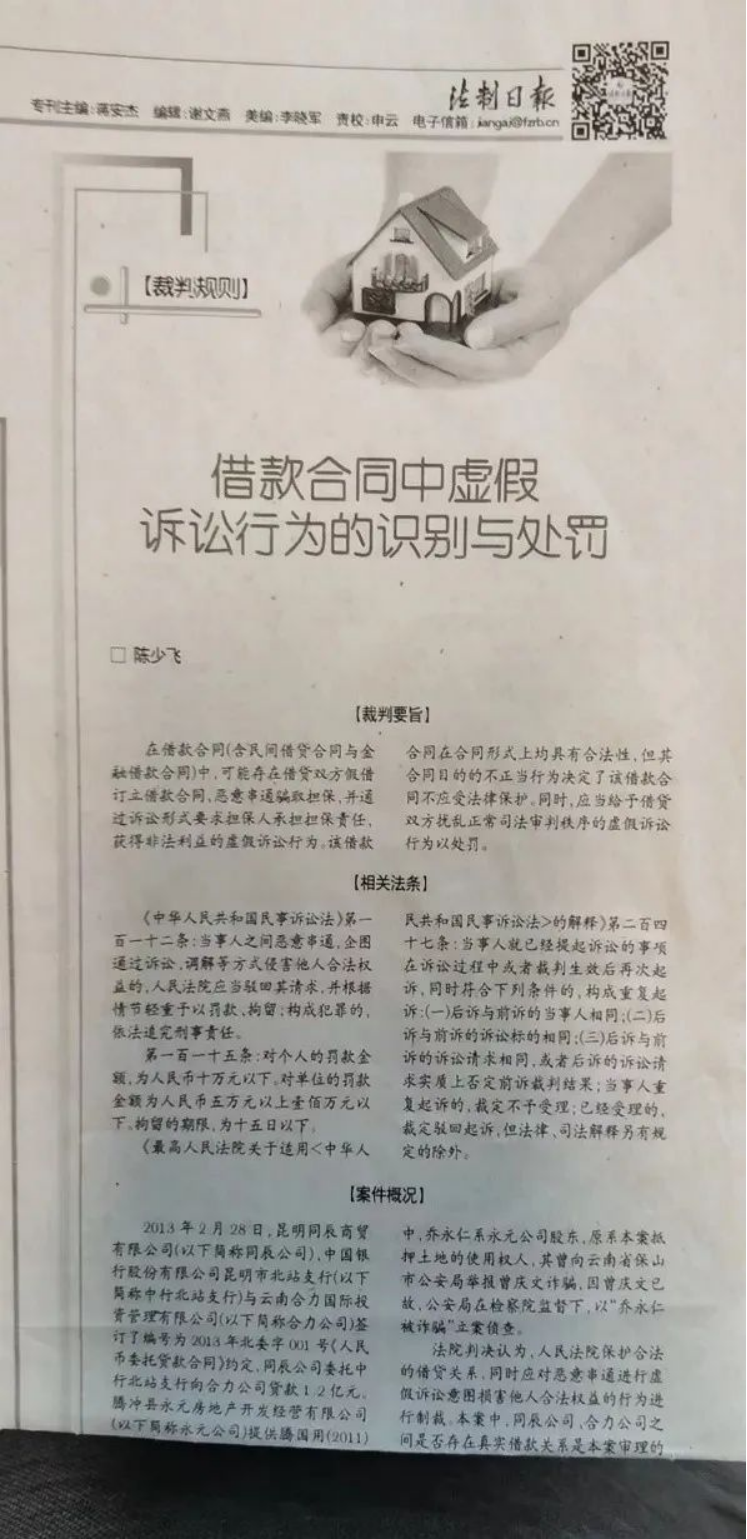在法院工作的这些年,陈少飞重视理论与实践相结合,多次在核心期刊发表文章。如中国应用法学上发表的《论矿产权抵押担保中债权人的风险防范》,在法制日报上发表的《储户资金被盗并已刑事立案后纠纷的可司法性》《借款合同中虚假诉讼行为的识别与处罚》。此外,其撰写的《昆明同辰商贸有限公司诉云南合力国际投资管理有限公司、腾冲县永元房地产开发经营有限公司借款合同纠纷案》更是荣获全国法院系统第四届全国青年法官优秀案例评选三等奖。